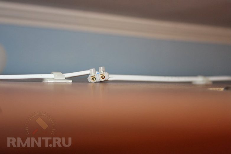 Зачищаем концы провода № 1 и закрепляем на них клеммник. Это будет точка для присоединения крайнего левого светильника.