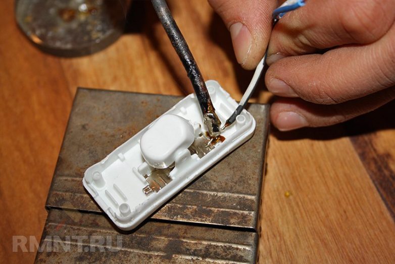 Зачищаем клеммы выключателя. Лудим их и припаиваем жилы провода. Важно, чтобы канифоль не попала на контакт выключателя. Если это произошло, ее можно удалить, протерев контакт спиртом.