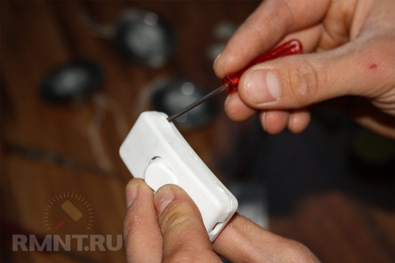 Присоединим провод к выключателю. Для этого необходимо вскрыть его корпус. Делаем это, аккуратно поддевая его по периметру отверткой.