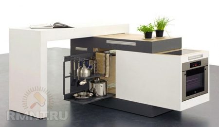 Если у вас достаточно места для посуды, а вот бытовую технику встроить некуда, кухонный остров тоже придет на выручку. Вместо острова-буфета вы сможете обустроить остров, буквально «напичканный» помощниками в деле приготовления еды.