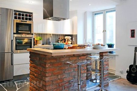 Барная стойка становится все более распространенным вариантом обустройства кухни. Почему бы и нет — красиво, необычно, удобно, можно принимать гостей в комнате, очень похожей на уютное кафе. А если расположить барную стойку посередине кухни, получится все тот же остров.