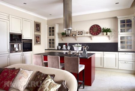 Темно-красное основание и благородная грифельно-серая столешница острова на этой кухне резко отличаются от молочных фасадов шкафов. При этом в общий интерьер остров вписался идеально благодаря кухонному фартуку и большим круглым часам таких же оттенков.