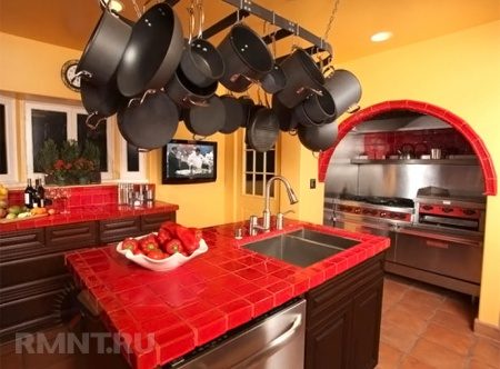 Очень яркая кухня с красной клетчатой столешницей и островом с мойкой. Изюминкой интерьера стали кастрюли и сковороды, подвешенные на металлическом креплении прямо над островом.