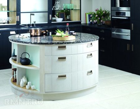 Остров может быть круглым полностью, от пола и до столешницы. А может быть стандартной квадратной или прямоугольной формы, но накрыт закругленной столешницей. Связано это с тем, что в квадратном основании проще расположить ящики и полки, встроить в остров бытовую технику.