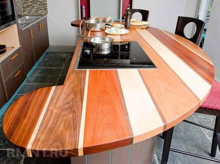 Посмотрите, как необычно выглядит этот кухонный остров, полукруглый с одной стороны и с закругленными краями с другой! Особого шарма ему добавило использование на столешнице разных пород древесины.