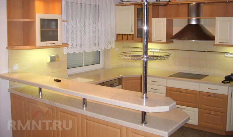 Кухонный остров с разноуровневой столешницей из искусственного камня стал главным украшением этой просторной кухни4. Ламинированная ДСП