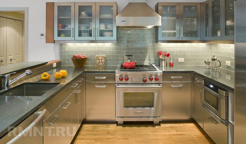 Прекрасный выбор для кухни ресторана или кафе, а вот в доме может выглядеть слишком холодно. На блестящей поверхности отлично видны следы от пальцев и разводы, что существенно затрудняет уборку — нужно использовать специальные моющие средства. Со временем даже на таком прочном материале, как нержавеющая сталь, могут появиться следы от ударов — вмятины, а также царапины. Под воздействием химических веществ на поверхности могут остаться несмывающиеся разводы. Стальная поверхность будет грохотать каждый раз, когда вы ставите кастрюлю или другие металлические предметы. Стоит достаточно дорого — порядка 700 долларов за квадратный метр.