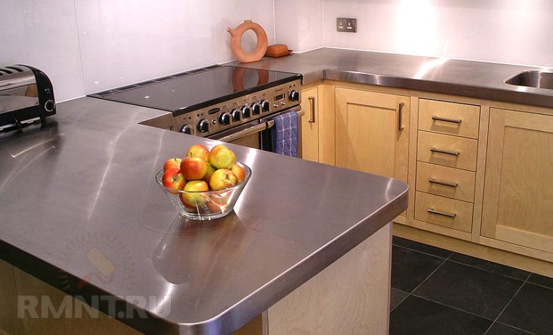 Верхний слой ламинированной древесно-стружечной плиты со временем под воздействием высокой температуры и влаги может отслоиться. Срок эксплуатации таких столешниц значительно меньше, чем у сделанных из натурального или искусственного камня5. Нержавейка