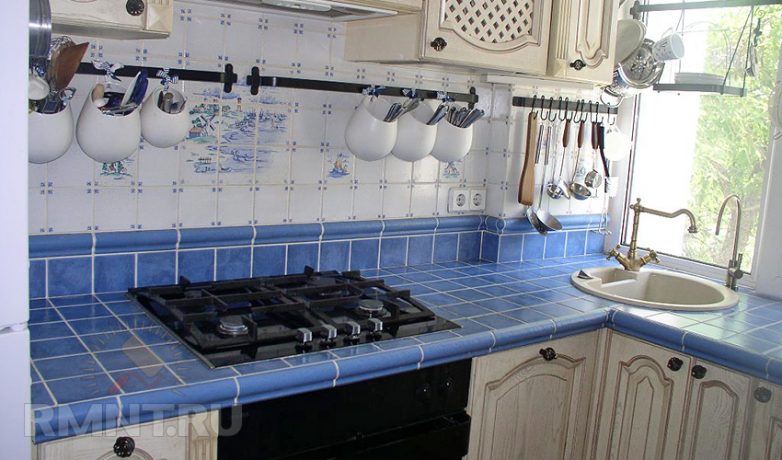 Плитка на кухонной столешнице — традиционный вариант для комнаты в средиземноморском стиле