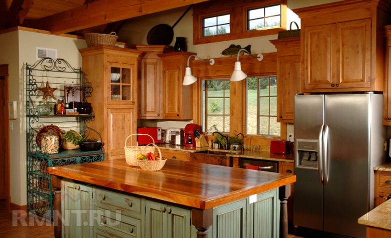 Такой вариант кухонной столешницы — из цельного массива дерева — принято называть «блок мясника». Грубовато, но интересно