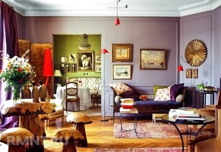 В целом можно сказать, что выбор цвета для вашей комнаты в стиле бохо зависит только от настроения. Обычно владельцы, создавая такой творческий интерьер, даже не задумываются, что получится, если рядом поставить вот этот салатовый диван и сиреневый пуфик. Интересно, что в результате как раз и получается стиль бохо!