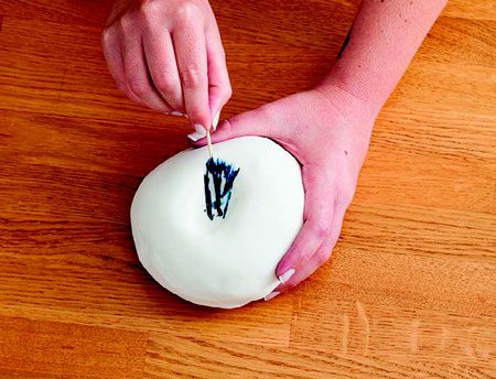 Для цвета «под мрамор»: скатываем валик, складываем его вдвое, снова скатываем валик, снова складываем вдвое, и так несколько раз, до появления цветных полос. Сворачиваем валик улиткой и раскатываем скалкой. При этом мастику нужно посыпать сахарной пудрой или крахмалом, чтобы она не прилипала.