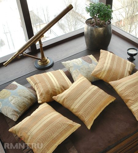Следующий момент — обустройство мягкой поверхности. Согласитесь, что сидеть на пластике или камне будет не слишком удобно. Самый простой вариант — сшитый по размерам расширенного подоконника матрас или несколько подушек, просто брошенных на сиденье из дерева или ламинированного ДСП.
