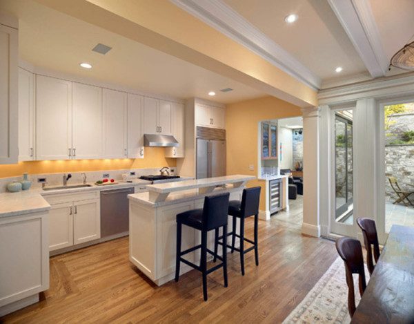 Довольно часто современные кухни имеют несколько зажатый вид, когда, казалось бы, в немаленьком помещении даже повернуться негде. Однако это легко исправить, если избавиться от надоедливых навесных кухонных шкафов.