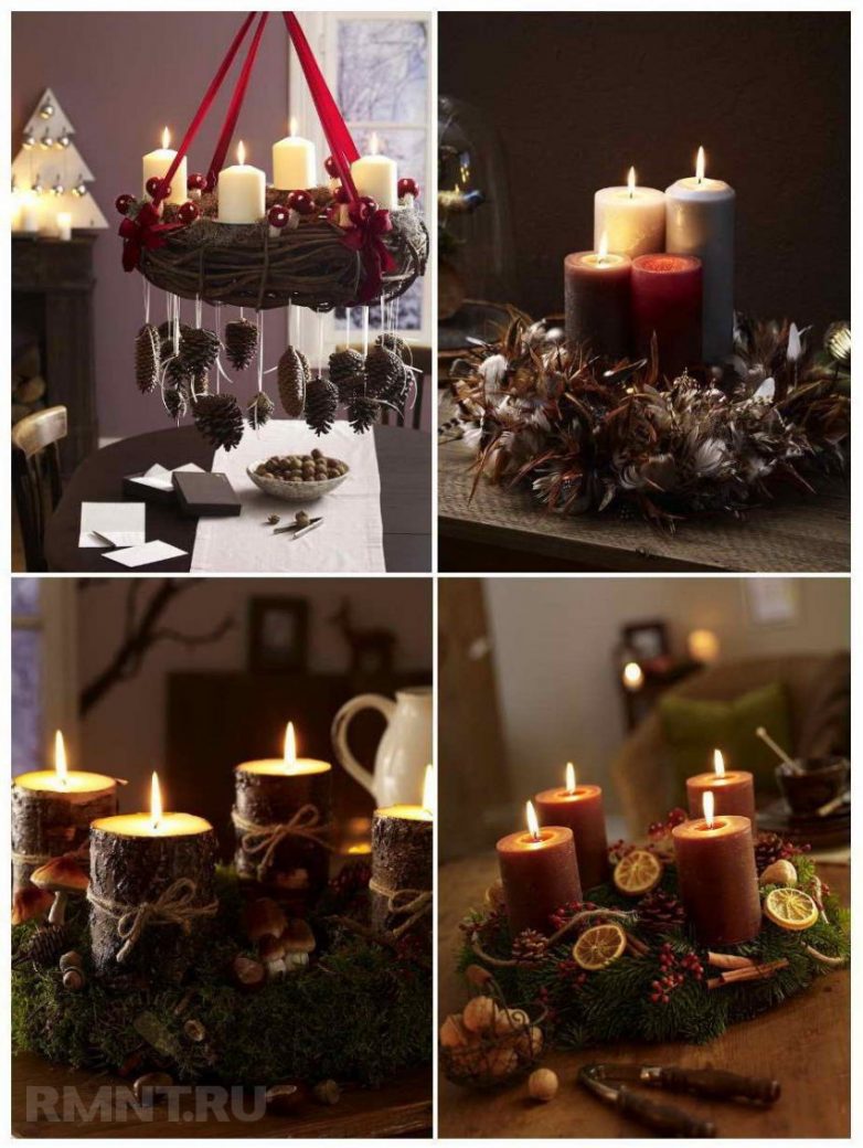 Свечи в окружении лапника, мха и коры, украшения в виде шишек, орехов, засушенных грибов и лесных ягод — это наилучший вариант новогоднего декора для интерьера в деревенском стиле.Каждый из предложенных нами вариантов декорирования вашего дома к новому 2015 году хорош по-своему — есть экстравагантные и нейтральные, трендовые и традиционные решения.
