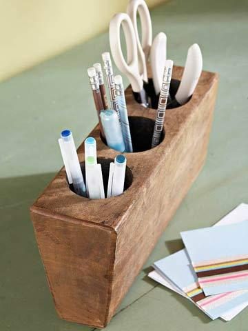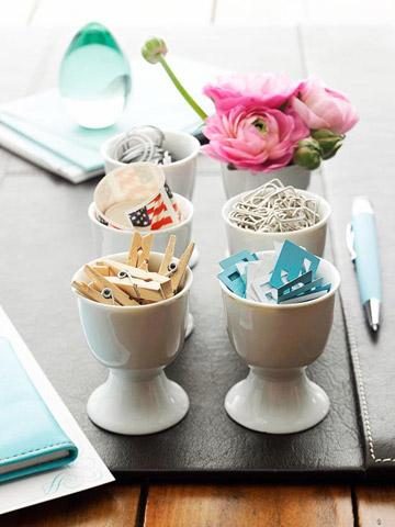 Различные мелкие вещи – канцелярские принадлежности, бытовые мелочи – удобно хранить в стильных вазочках или чашках.