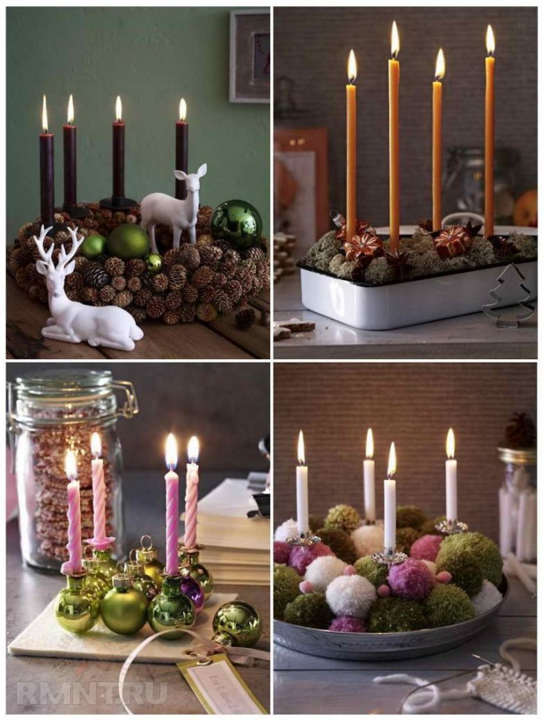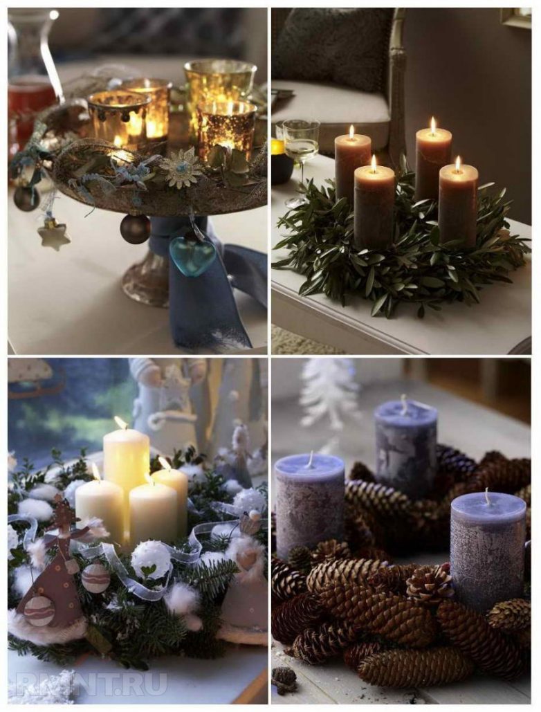 Выразительное колористическое решение для праздничной композиции со свечами — объединение оливкового с сиреневым и белым цветом или травянисто-зеленого с коричневым.Обширная палитра зеленых и синих оттенков, а также их сочетаемость между собой намного упрощают процесс поиска колористической схемы для новогоднего интерьера 2015. Нежные пастельные комбинации или яркие контрастные — выбор цветовых дуэтов и трио для праздничного декора практически безграничен. Важно лишь правильно объединить оттенки и взять их в нужных пропорциях, не забывая о существующей цветовой гамме, заложенной в дизайн вашего дома.