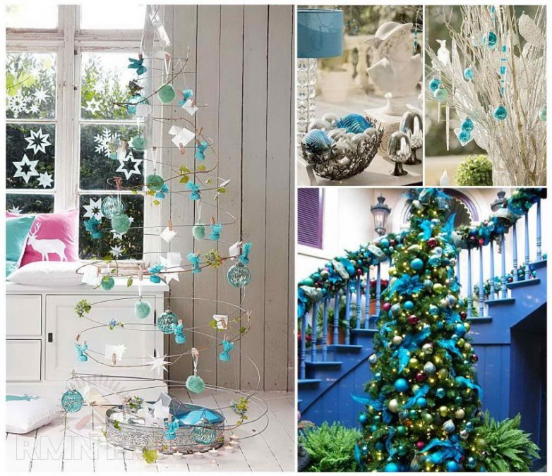 Яркие бирюзовые тона новогоднего убранства гармонично комбинируются с серебристо-серыми, охристыми и зелеными красками. Насыщенные оттенки голубого декора смотрятся выигрышно на фоне темного дерева и патинированного металла.