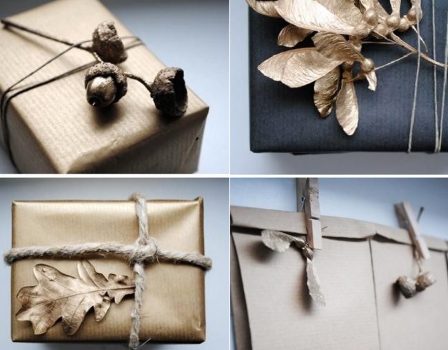 Если у вас есть баллончик краски — превратить в украшение можно что угодно. Главное — вовремя остановиться. Для упаковки подарка отлично подойдут золотые веточки, шишки, листья и другие «природные» мелочи.