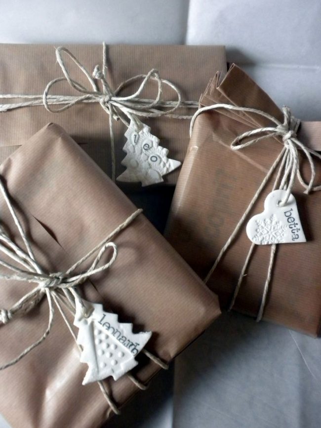 Известный еще с начальной школы рецепт соленого теста пригодится нам и в непростом, но приятном деле упаковки подарков. Самые обычные формочки для печенья (а сейчас можно найти формочки и на новогоднюю тематику) и самые простые материалы — симпатичные ярлычки для подарков готовы. Узоры на тесте можно делать любыми подручными средствами, — например, приложить вязаную салфетку и прижать, получится красивый вязаный узор.