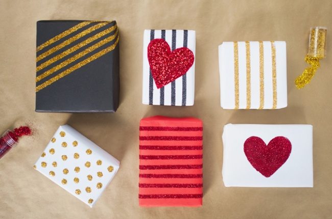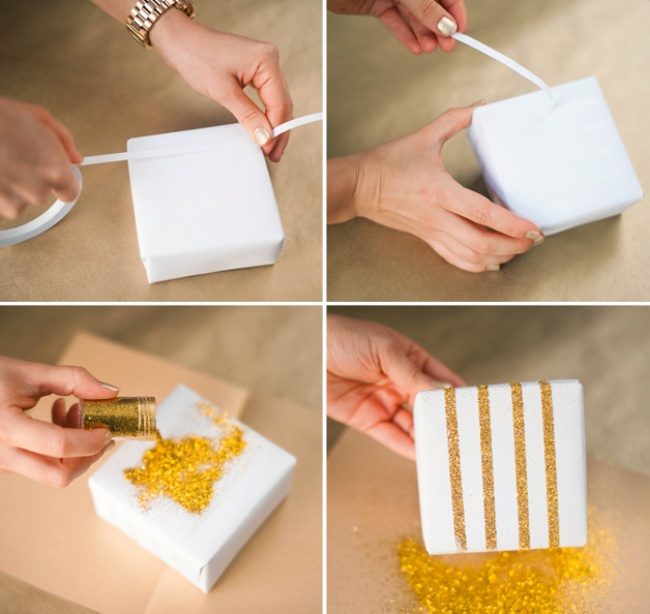 Клей или двусторонний скотч и блестки россыпью — просто и доступно, а в качестве бонуса — бесконечное множество вариантов украсить любую упаковку. Да и не только упаковку — в процессе трудно остановиться и не украсить что-то еще и еще…