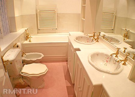 Нежная ванная в дворцовом стиле барокко. Все краны, а их здесь немало, выдержаны в едином стиле и превосходно сочетаются с необычными раковинами и другой сантехникой. Обустроить подобный интерьер в ванной комнате — удовольствие не из дешевых.