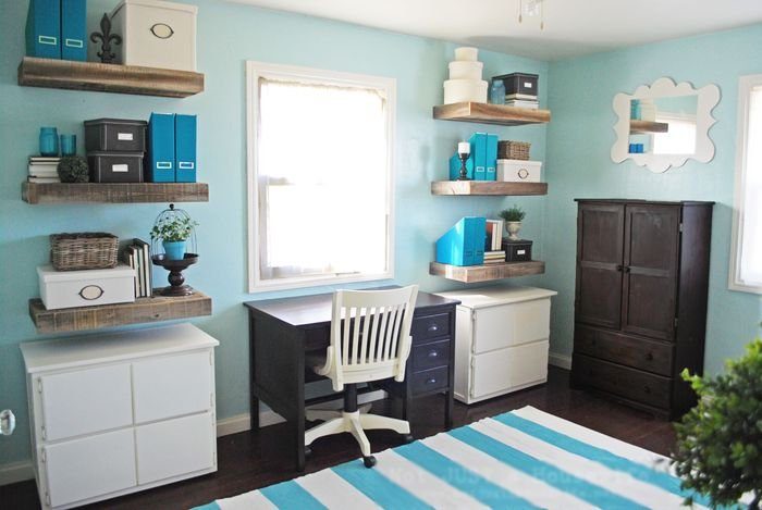 Оформление домашнего офиса — крайне сложная задача. С одной стороны, он должен выглядеть профессионально и строго, чтобы дать возможность сосредоточиться на работе. С другой стороны, интерьер домашнего офиса должен быть гостеприимным и вызывать желание поработать, а не отторжение. Поэтому лучше использовать смелые цвета. Бирюза — отличный выбор. Потому что этот цвет привлекательный и в то же время не раздражающий глаза. Он яркий, но не отвлекающий. Поэтому вы сможете в комфорте сосредоточиться на работе.