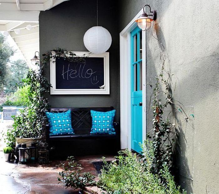 Первые впечатления всегда самые яркие. Поэтому постарайтесь создать сильное впечатление уже на входе. Выбирайте смелые красочные входные двери. В сочетании с простым нейтральным фасадом дверь будет выгодно выделяться и притягивать внимание. Бирюзовая дверь хорошо смотрится на темно-сером или черном фоне.