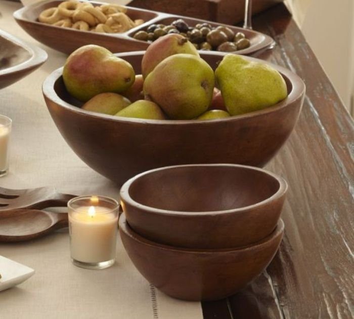 Уютно, красиво, по-деревенски. Сервировать стол этими чашками — одно удовольствие. Делайте выбор в пользу хорошо полированного твердого дерева. Салат с майонезом сюда класть не рекомендуется, но свежую выпечку, овощи и фрукты, отварной молодой картофель положить можно.