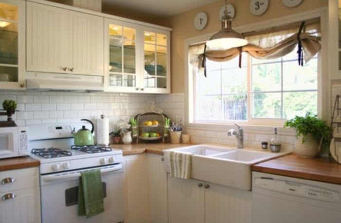 Даже обычные белые рамы на окнах придают этой кухне некий деревенский шарм. Правильный акцент на окнах здесь создает драпировка из мешковины. Небрежно накинутое полотно, подвязанное декоративными резинками, придает кухне очень простой и гостеприимный вид. Кажется, будто она пронизана запахом свежевыпеченных сладких булочек.