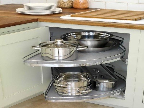 Использование труднодоступных зон в угловых шкафах, пространства под мойкой и т.д. Для этого существуют специальные конструкции полок типа «карусель» или углового варианта.