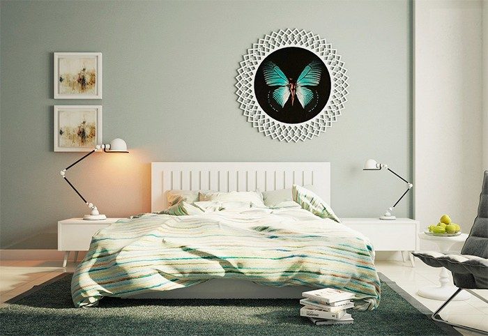 Крупное, выразительное изображение бабочки может сделать комнату чувственнее. Это прекрасный вариант оформления спальни для романтичных, но ценящих элегантность и натур.