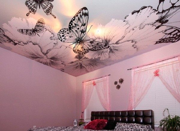 Орнамент «бабочки» может украшать не только стены, текстиль или обивку мебели. Потолок с изысканными, крупными бабочками производит неизгладимое впечатление!