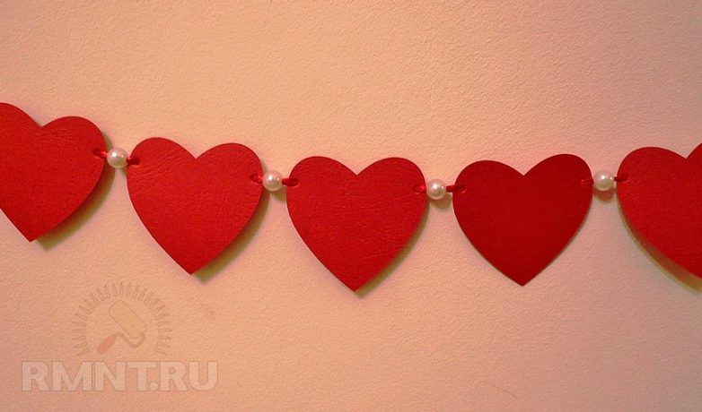 Очень нежный веночек из бумажных сердец можно просто повесить на стену. Вырезают сердечки и из салфеток, старых открыток, цветной бумаги. Да и готовые приобрести сегодня не составит труда.