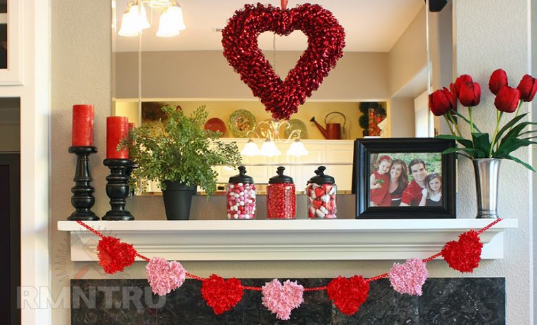 Каминную полку решено было украсить целой гирляндой сердечек, букетом тюльпанов, красными свечами и, конечно же, семейной фотографией.