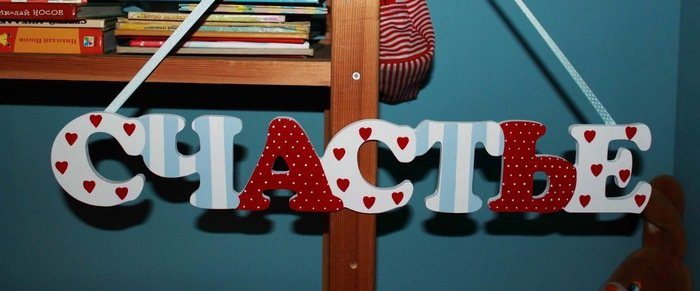 Буквы можно нарисовать, написать, наклеить, вырезать из фанеры или сшить. Все зависит от ваших пожеланий, умений, фантазии и помещения, которое вы хотите украсить. Если вы стремитесь создать стильный интерьер, то надписи и знаки должны быть естественным продолжением, не выбиваться из общей тональности, а стать значимым акцентом, центральной деталью, на которой интересно останавливать взгляд и которая заставляет задуматься о вечном.