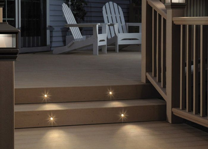 Лестница станет гораздо безопаснее, а вид — значительно живописнее, если добавить крыльцу несколько встроенных светильников. В ассортименте таких лампочек обязательно найдется предложение с повышенной влагостойкостью и ударопрочностью, чтобы свет на улице служил долго, стоил недорого, а смотрелся весьма эффектно.