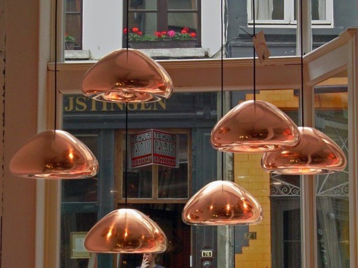 Нарядный и самодостаточный вид медных изделий просится в интерьер с однотонными стенами или с обоями со сдержанным двухцветным орнаментом. Подвесная лампа — вещь основательная, на века, она сочетается с богатыми фактурами, кожей и темным деревом, глянцевой керамической плиткой глубокого оттенка, ковром с щедрым ворсом. Элегантный и лаконичный силуэт ламп дизайнера Тома Диксона не позволяет меди обесцениться, не превращает убранство в балаган, а держится на уровне уверенного, хорошего вкуса хозяев дома.