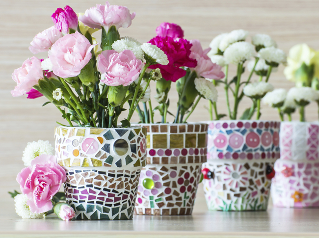 Наносим на стекло сусальное золото или краску. Фото: ДомашнийВот и все, остается самое приятное – декорирование самого горшка. С помощью специального горячего клея нанесите разноцветные осколки на горшок и декорируйте по своему вкусу. В итоге вы получите невероятно красивый аксессуар для квартиры.