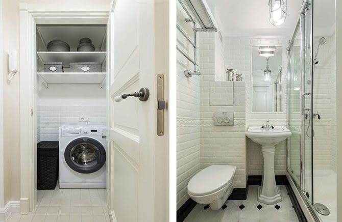 Диванная зона отделена от кухни барной стойкой, которая выполняет функции обеденного, фуршетного и рабочего стола. Вход в санузел перенесли. По мнению автора проекта, за счет этого удалось рационально организовать пространство помещения. В коридоре теперь нашлось место для шкафа и кресла. Там же сделали подсобный шкаф со стиральной машиной и дополнительными местами для хранения, что позволило освободить ванную от лишних хозяйственных предметов.