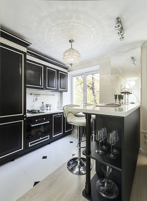 Практически вся мебель светлого тона. Зеркала в створках гардероба дают ощущение дополнительного пространства. Необходимый контраст задают аксессуары, чугунные радиаторы графитного цвета и черная кухонная мебель, украшенная сусальным золотом.