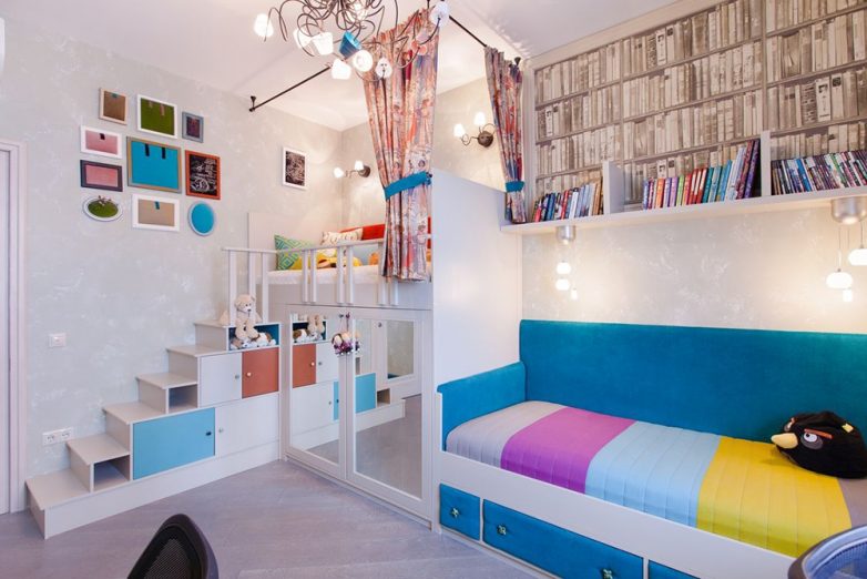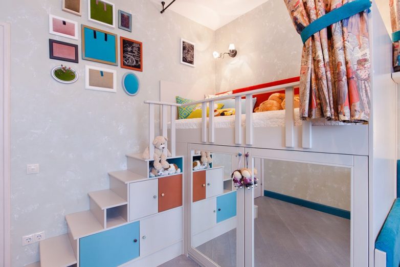 Детская комната решена функционально. Для девочки и мальчика выделили по рабочему месту и организовали собственные мини-спальни, которые разнесли по вертикали и горизонтали. Кровать мальчика оформлена в виде диванчика, обтянутого бирюзовой тканью, а уголок выглядит как кабинет с библиотечными полками. Двухъярусная девичья кровать закрывается шторами. Под спальным местом, за зеркальными дверцами, спрятан маленький шкаф.