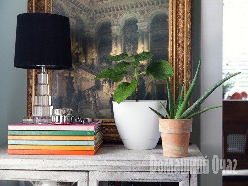 Словосочетание «настольный пейзаж» («тейблскейп») давно уже вошло в обиход дизайнеров интерьера. Родился этот стиль в Англии, где придумали составлять композиции на письменных, туалетных и журнальных столиках из вещей привычного обихода. Посмотрите на фото: здесь стопка книг служит подставкой для настольной лампы, рядом несколько горшков с цветами и все это на фоне старинной картины, стоящей на тумбочке. Фишка: все предметы разной высоты.