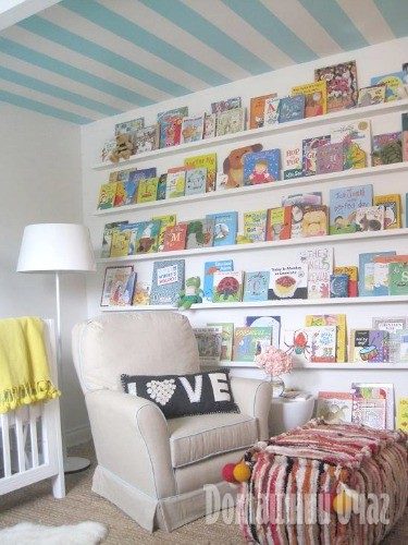 Думаете, чем украсить пустующую стену в детской комнате? Конечно же, книгами! Сделайте небольшие полки во всю стену и расставьте там детские книги. Они выглядят как произведения искусства, но дело даже не в этом: они так и просятся, чтобы их почитали перед сном.