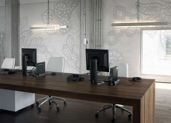Стеклянные или выполненные из прозрачного пластика перегородки с нанесенным на них кружевным орнаментом придают интерьеру изящество и визуальную легкость. Узор выглядит так, словно он висит в воздухе, и это очень красиво!