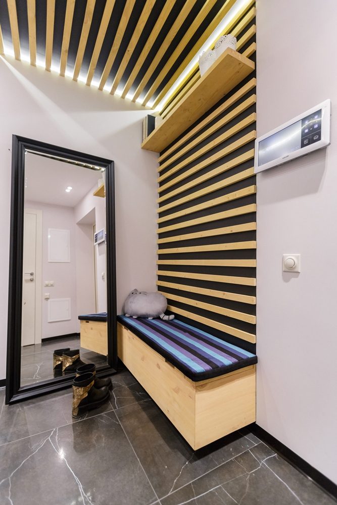 Стилистическое решение формировалось вслед за планировочным. Так, продолговатую форму коридора решили уравновесить поперечными деревянными рейками, закрепив их на выкрашенном в черный цвет потолке. Рейки симметрично спускаются с противоположных стен, образуя книжный стеллаж с одной стороны и заканчиваясь тумбой с другой. Тумба изготовлена на заказ по эскизам студии. С коридором перекликаются рейки на потолке лоджий. Фактура дерева возникает и в гостиной в отделке проема на лоджию: дизайнеры пошли на небольшую хитрость и использовали в качестве отделочного материала стен напольный ламинат, что позволило значительно сэкономить.