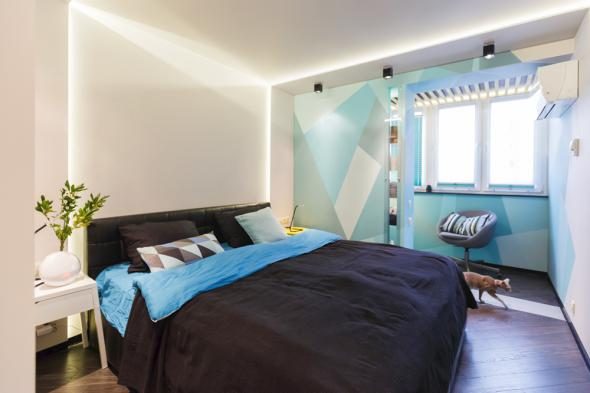 Геометрическое граффити на стенах спальни было предложено самими хозяевами. Цветные грани разбивают однотонную поверхность стен и придают ощущение глубины и объема интерьеру.