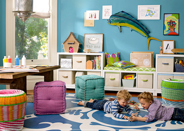 В детской контемпорари пригодятся цветные плетеные пуфы, являющиеся одновременно и ящиками для игрушек. Огромный плюс плетеной мебели, делающий ее замечательным выбором для комнаты ребенка: она легкая, обычно не имеет острых углов, поэтому риск пораниться об нее чрезвычайно мал. К тому же благодаря легкости даже маленькие дети могут сами переставлять плетеные вещи с места на место — например, для игр.