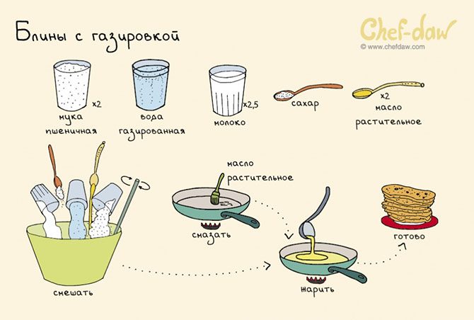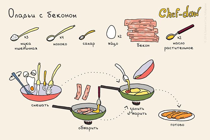 Иллюстраторы и просто хорошие люди Галина и Станислав Хабаровы придумали крутой проект рисованных кулинарных рецептов на открытках Chef-daw. В каждом таком рецепте они просто и, главное, понятно указывают ингредиенты, их количество — и что со всем этим добром, собственно, делать. Разобраться сможет даже ребенок.
