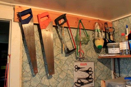 Ножовки по дереву и по металлу, защитные маски, защитные очки. Висят себе под потолком, места почти не занимают. Цена вопроса — обрезок доски и несколько саморезов. Если бы в эти стены можно было вкручивать саморезы напрямую, то и доска бы не понадобилась. Но стены в бытовке из тоненьких листов ДВП, а внутри утеплитель из минваты. Пришлось сначала крепить доску.